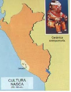 La cultura Nazca se desarrollaron a partir del 200 d. C. - 700 d.c. Este pueblo desarrollo una refinadan tecnológia alfarera , sus ceramicas fueron policromas con un sinumero de imágenes simbólicas. Sus vasos, jarras, recipeintes, etc., eran pintadas surtido de muchos diseños como el de aves, peces, frutas y figuras mitológicas. Los colores más comunes eran el negro, marrón, gris, rojo, amarillo, blanco y violeta. Sus dibujos de aves, peces, monos, plantas, arañas, y ballenas